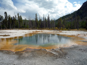 | イエローストーンで見られる熱水現象の全てがここで見られる所。 間欠泉、噴気孔の他に ・真っ青に透き通ったアルカリ性温泉・・・約90度もあり、高温でかなり深い。 ・マッドポット・・・流紋岩と蒸気が混ざり溶け泥を形成。 トレイルの脇には枯れ木が立っています。地熱のために枯れ、長い年月をかけて木の細胞に硫黄と炭素が 入り込み化石化してたとか。 | |